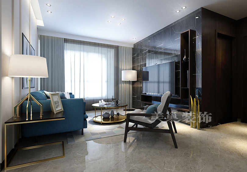天骄华庭3室2厅装修当代轻奢风120平户型案例——客堂电视配景墙,壁挂式埋伏电视整洁完备,大理石和石材砖越沉稳越舒服!