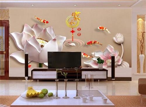 假如您想既省钱又雅观的话,不妨选用彩绘可能墙纸电视墙。图中即是一幅彩绘电视墙,它是以莲花和锦鲤鱼为主题的彩绘画,搭配上白色的电视柜,把客堂装扮的富有朝气。彩喷多回收具有防潮、防霉、可洗、耐热等效能的涂料,而市场上的墙纸、墙布有多种斑纹、图案,很是温馨、温顺。
